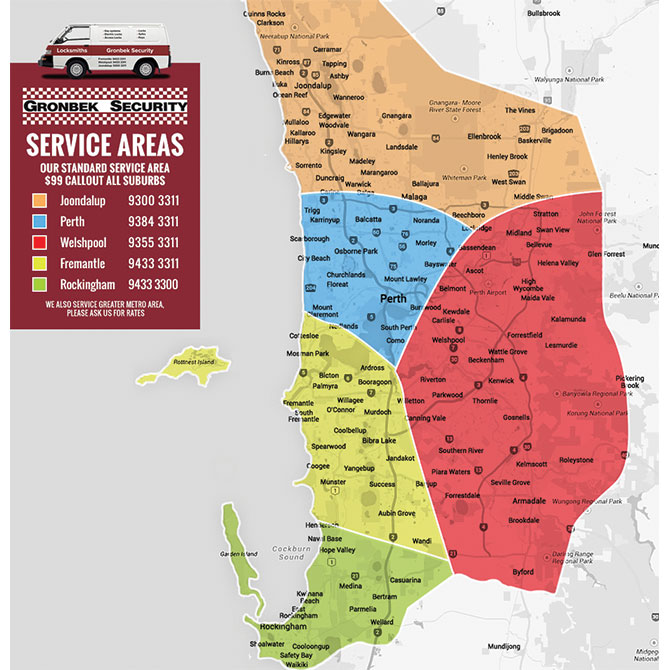 Gronbek Security is able to service your home or business in Armadale. Our professional locksmiths, with 8 fully-equipped vans service all suburbs in the City of Armadale. With two storefronts in Perth, in Fremantle and Welshpool, you can choose to visit us or we can come to you. Gronbek Security is the only locksmith in Perth that can provide a complete range of services including Automotive, 24/7 Emergency, Commercial or Residential. Our flexible service also covers Regional large commercial customers in WA country towns and minesites. With our long-term industry experience, our Armadale locksmiths can identify weaknesses in your home or business’s security.
